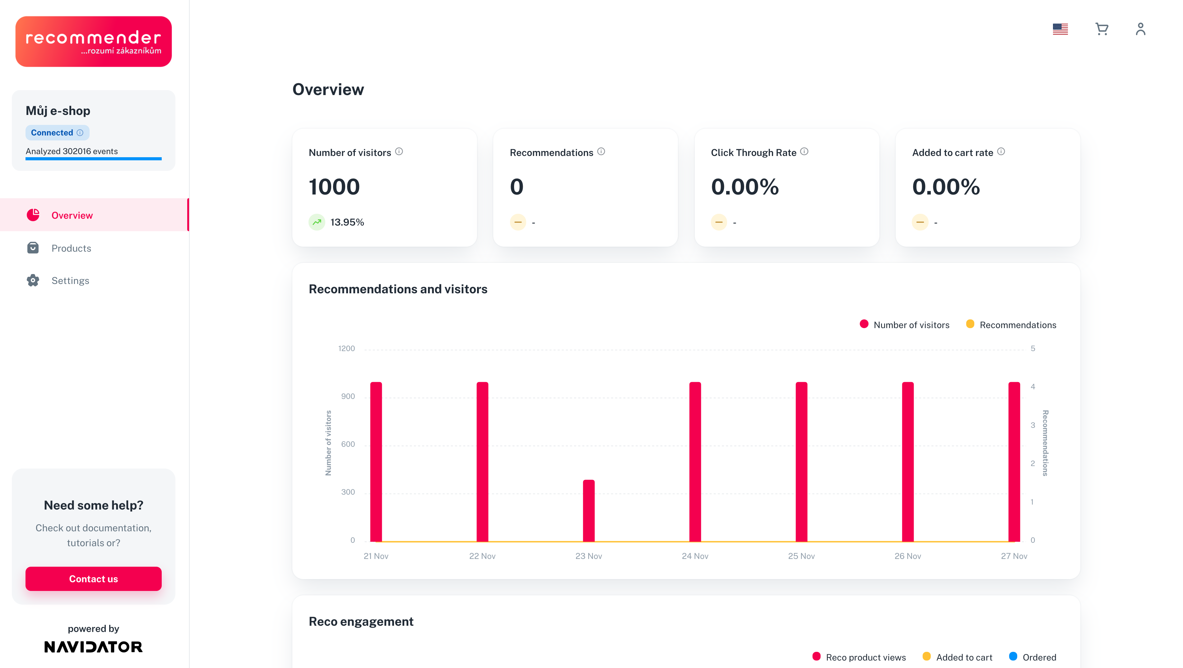 V uživatelském účtu uvidíte informace o počtu unikátních návštěv vašeho e-shopu, navštívených produktech, zobrazených doporučení a rovněž informaci, jak byla zobrazená doporučení přesná. Přesnost hodnotíme následujícími metrikami: míra proklikovosti doporučení, míra přidání doporučených produktů do košíku a míra objednání doporučených produktů. Tyto informace jsou nyní k dispozici s denní frekvencí.