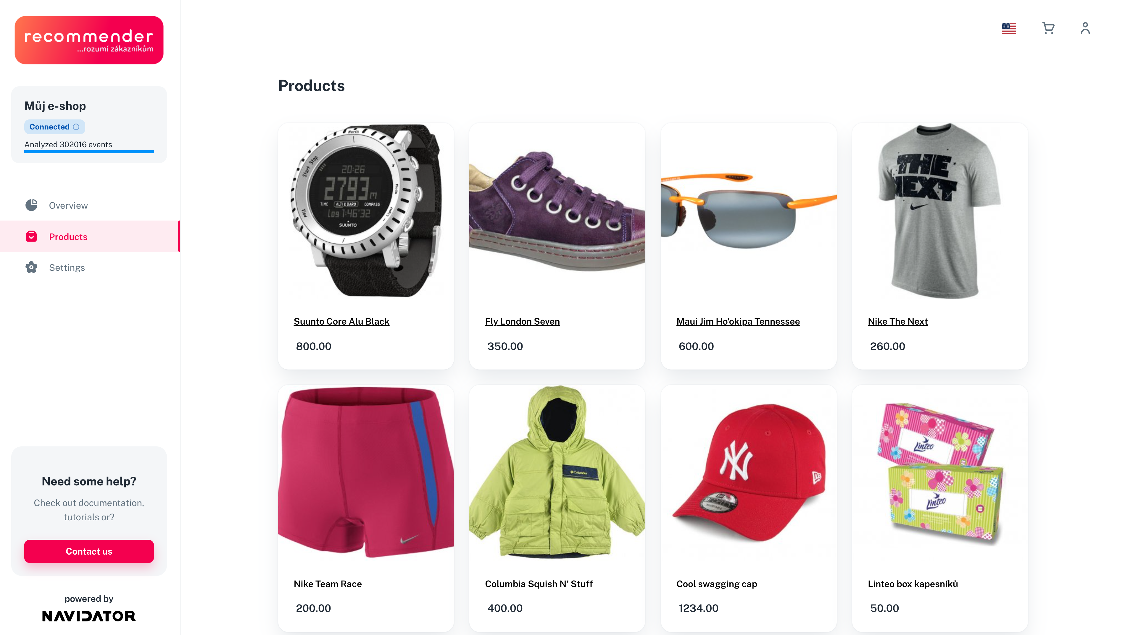Recommender se připojí k vašemu eshopu, načítá informace o produktech a analyzuje chování zákazníků. Do několik hodin je připraven zobrazovat zákazníkům produkty dle jejich preferencí.