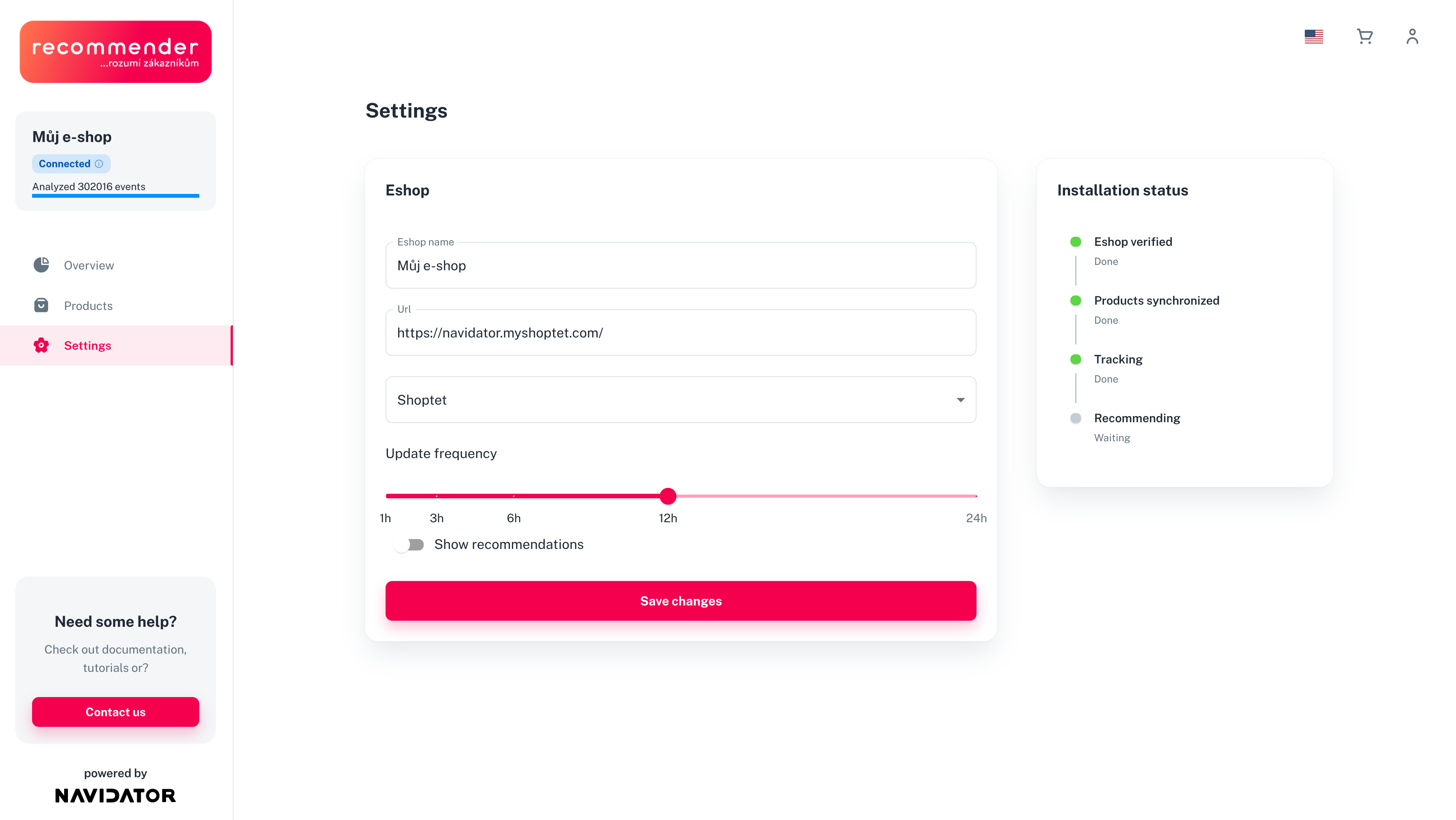 Instalaci spustíte jedním kliknutím na stránce produktu Recommender na Shoptet.cz nebo v administračním rozhraní vašeho e-shopu na Shoptetu.